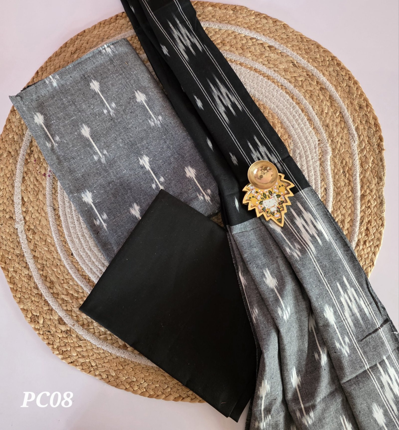 A timeless weave that feels like poetry in threads. Crafted from pure cotton and adorned with traditional Pochampally Ikat patterns, this set blends heritage with everyday elegance. Each piece carries the beauty of hand-dyed yarns woven into striking geometric motifs—making every outfit effortlessly unique.